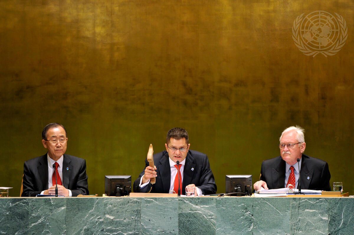 Vuk Jeremic (centre), President of the sixty-seventh session of the General Assembly, opens the Assembly’s High-level Meeting on the Rule of Law at the National and International Levels. He is flanked by Secretary-General Ban Ki-moon (left) and Jean-Jacques Graisse, Acting Head of General Assembly and Conference Management.