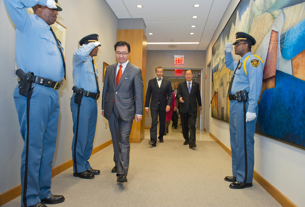 UN Security Officers salute as Yeocheol Yoon (in orange tie), UN Chief of Protocol, escorts Secretary-General Ban Ki-moon (right) and Toomas Hendrik Ilves (left), President of Estonia, to their bilateral meeting today at UN Headquarters in New York.