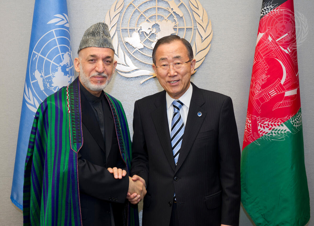 Secretary-General Ban Ki-moon (right) meets with Hâmid Karzai, President of Afghanistan.