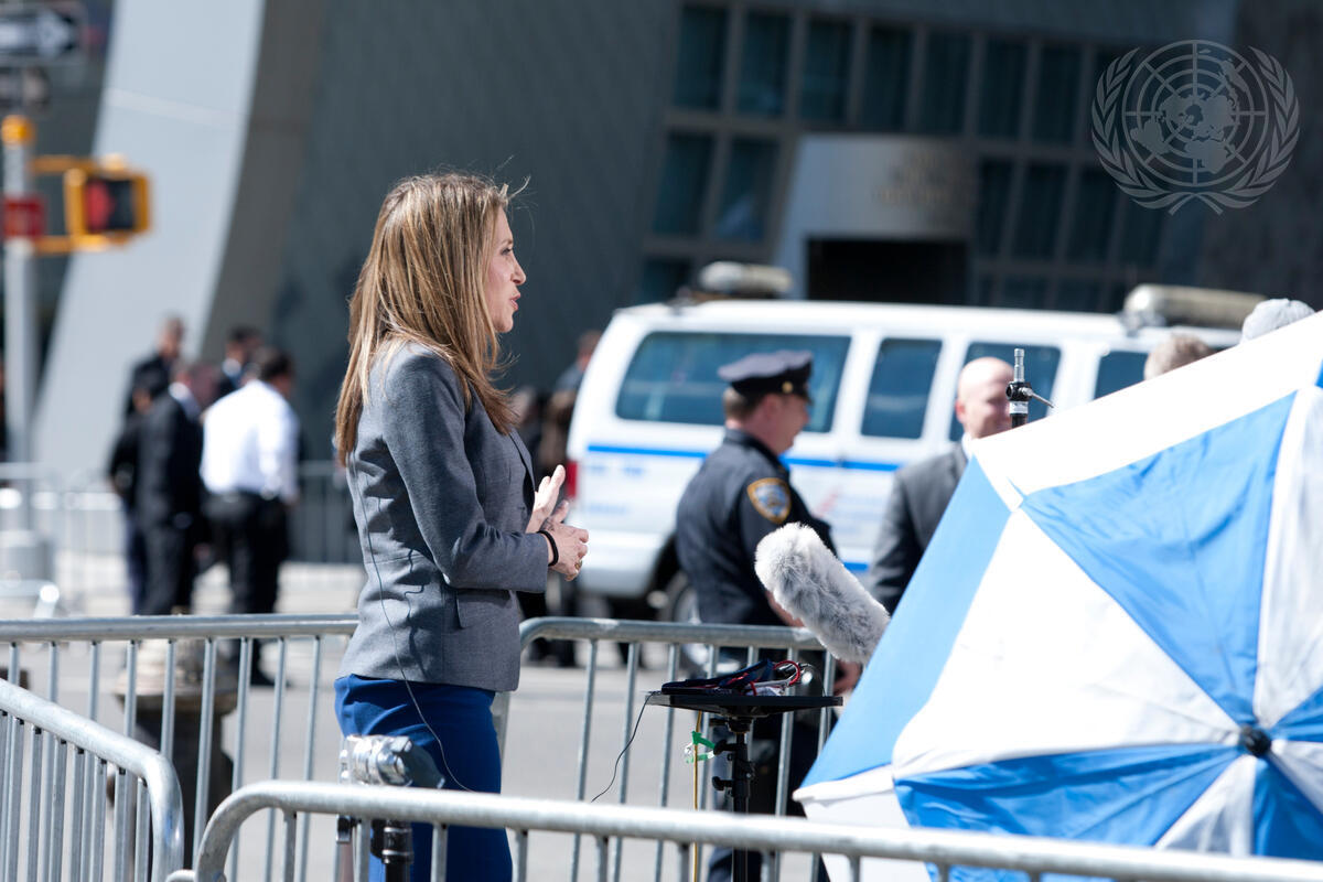Media crews have set up operations outside the UN Headquarters complex, to cover events taking place there, including the General Assembly general debate. A broadcast journalist files her dispatch.