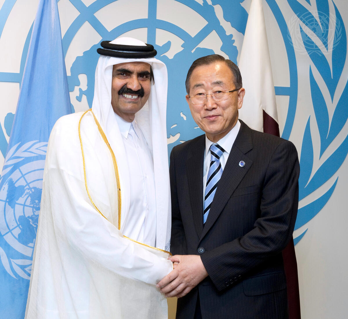 Secretary-General Ban Ki-moon (right), meets with Sheikh Hamad bin Khalifa Al-Thani, Amir of the State of Qatar.