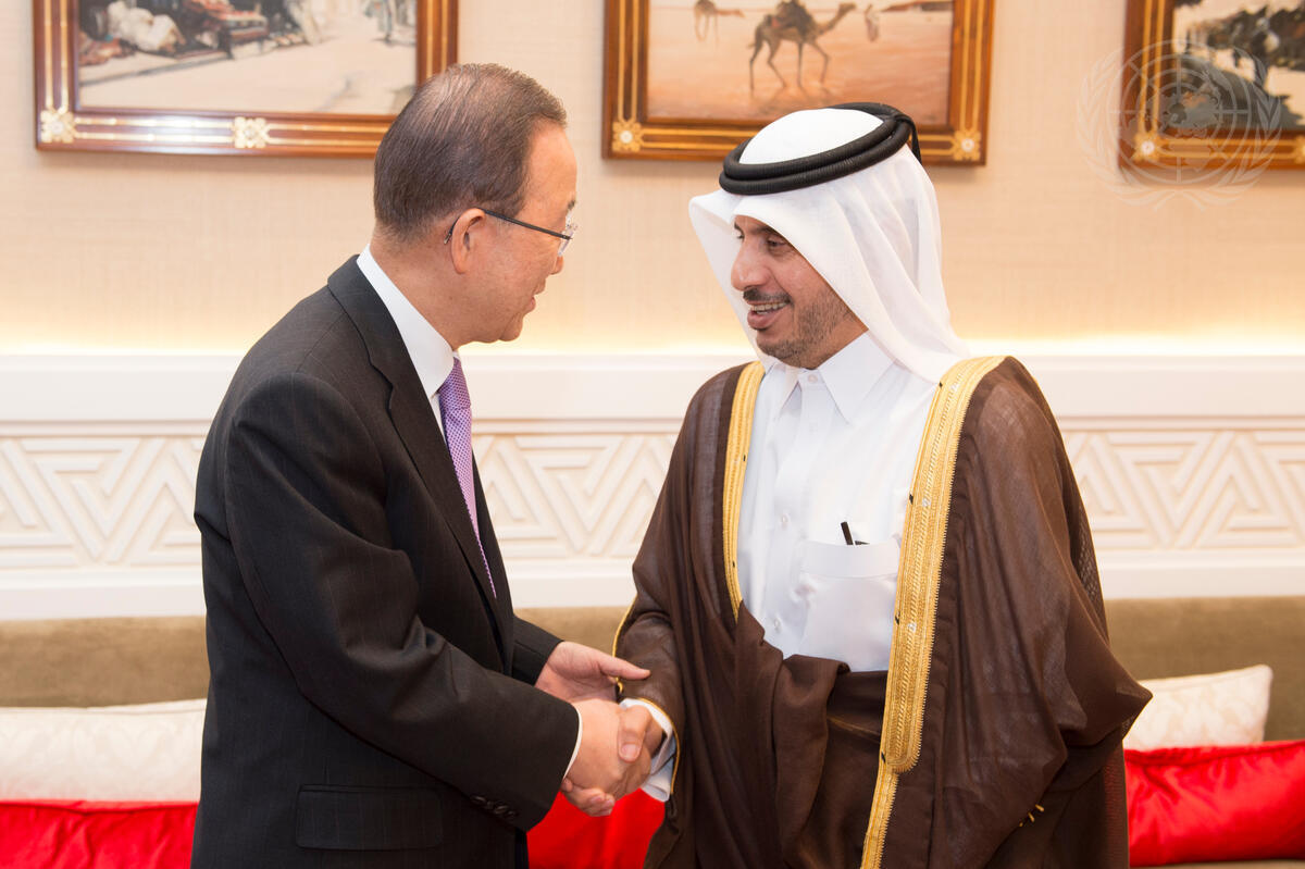 Secretary-General Ban Ki-moon (left) meets with Sheikh Abdullah bin Nasser bin Khalifa Al-Thani, Prime Minister and Minister for the Interior of the State of Qatar, in Doha today.