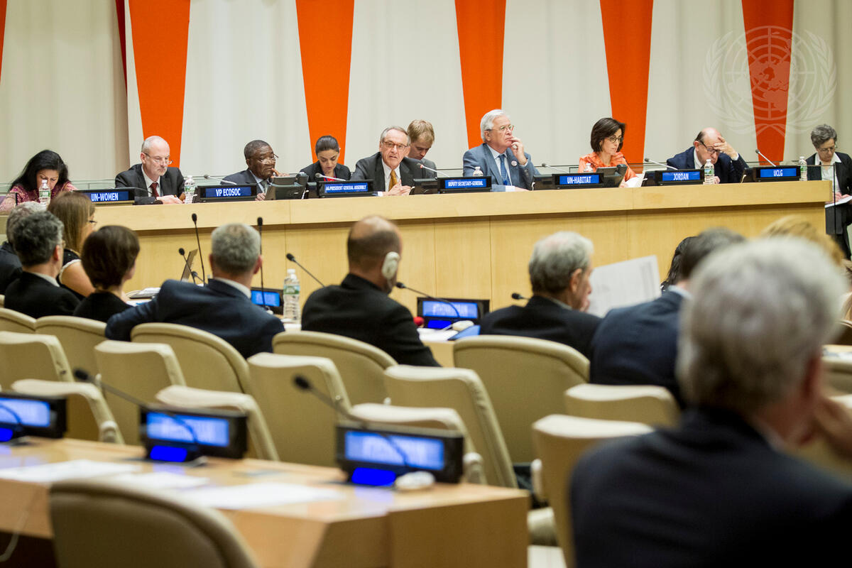 A view of the panel at today's High-level Event on ""Large Movements of Refugees and Migrants: Critical Challenges for Sustainable Urbanization"", held in the Economic and Social Council Chamber at UN Headquarters in New York. From left: Lakshmi Puri, Deputy Executive Director of the United Nations Entity for Gender Equality and the Empowerment of Women (UN Women) and Global Migration Group Chair for 2016; Sven Jürgenson, Permanent Representative of the Republic of Estonia to the UN and Vice-President of the Economic and Social Council (ECOSOC); Michel Tommo Monthe, Permanent Representative of the Republic of Cameroon to the UN and Acting President of the General Assembly; Deputy-Secretary-General Jan Eliasson; Joan Clos, Executive Director of United Nations Human Settlements Programme (UN-Habitat) and Secretary-General of the Habitat III Conference; Dina Kawar, Permanent Representative of Jordan to the UN and co-facilitator for the UN General Assembly High-Level Meeting on addressing large movements of refugees and migrants; and Josep Roig, Secretary-General of United Cities and Local Governments (UCLG).