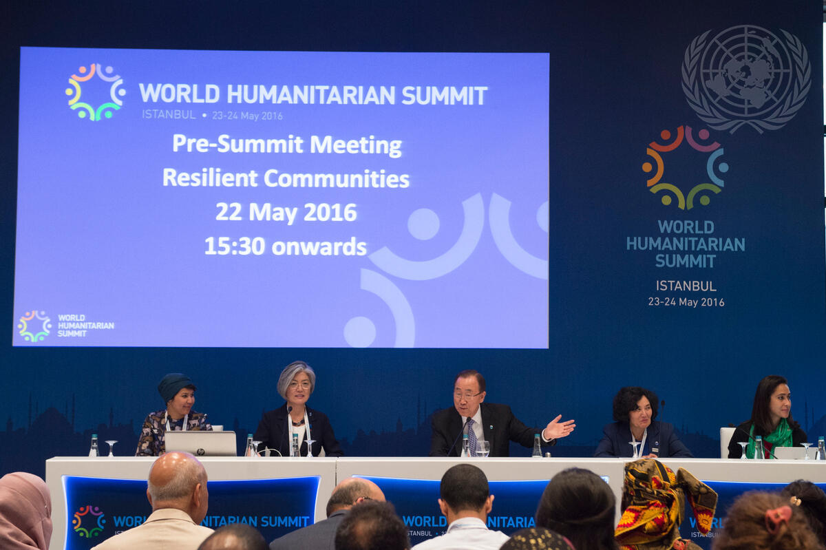 Secretary-General Ban Ki-moon (centre) speaks at the Resilient Communities meeting at the Lütfi Kirdar Convention and Exhibition Center (LKCC). The meeting takes place ahead of the first-ever World Humanitarian Summit (WHS), being held 23-24 May, 2016, in Istanbul, Turkey. Also on the panel are, from left: Rina Meutia, WHS Thematic Team Leader and Focal Point for the Resilient Communities group; Kyung-wha Kang, Assistant Secretary-General for Humanitarian Affairs and Deputy Emergency Relief Coordinator; Leila Zerrougui, Special Representative of the Secretary-General for Children and Armed Conflict; and Mervat Shelbaya, Deputy Chief of the WHS Secretariat.