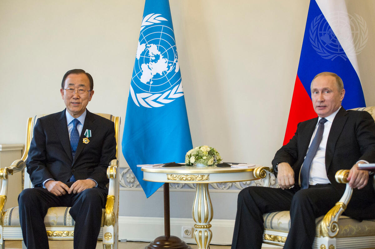 Secretary-General Ban Ki-moon received the Order of Friendship from Vladimir Putin, President of the Russian Federation, in St. Petersburg.