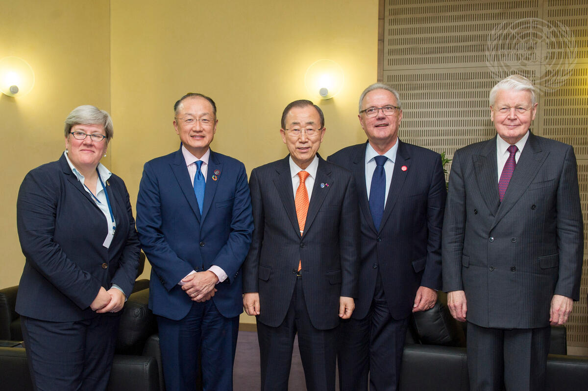 Secretary-General Ban Ki-moon (centre) poses with members of the Sustainable Energy for All Initiative (SE4ALL) Advisory Board, which held a meeting today in Brussels and announced its new five-year strategy. Also pictured are, from left: Rachel Kyte, Special Representative of the Secretary-General and Chief Executive Officer of SE4All; World Bank Group President Jim Yong Kim; Neven Mimica, European Commissioner for International Cooperation and Development; and Ólafur Ragnar Grímsson, President of Iceland and member of the SE4ALL Advisory Board.