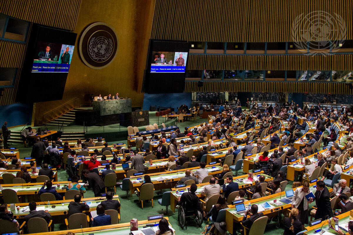 A wide view of the General Assembly Hall during the opening of the Ninth Session of the Conference of States Parties to the Convention on the Rights of Persons with Disabilities as Oh Joon, Permanent Representative of the Republic of Korea to the UN and President of the Conference, makes introductory remarks.