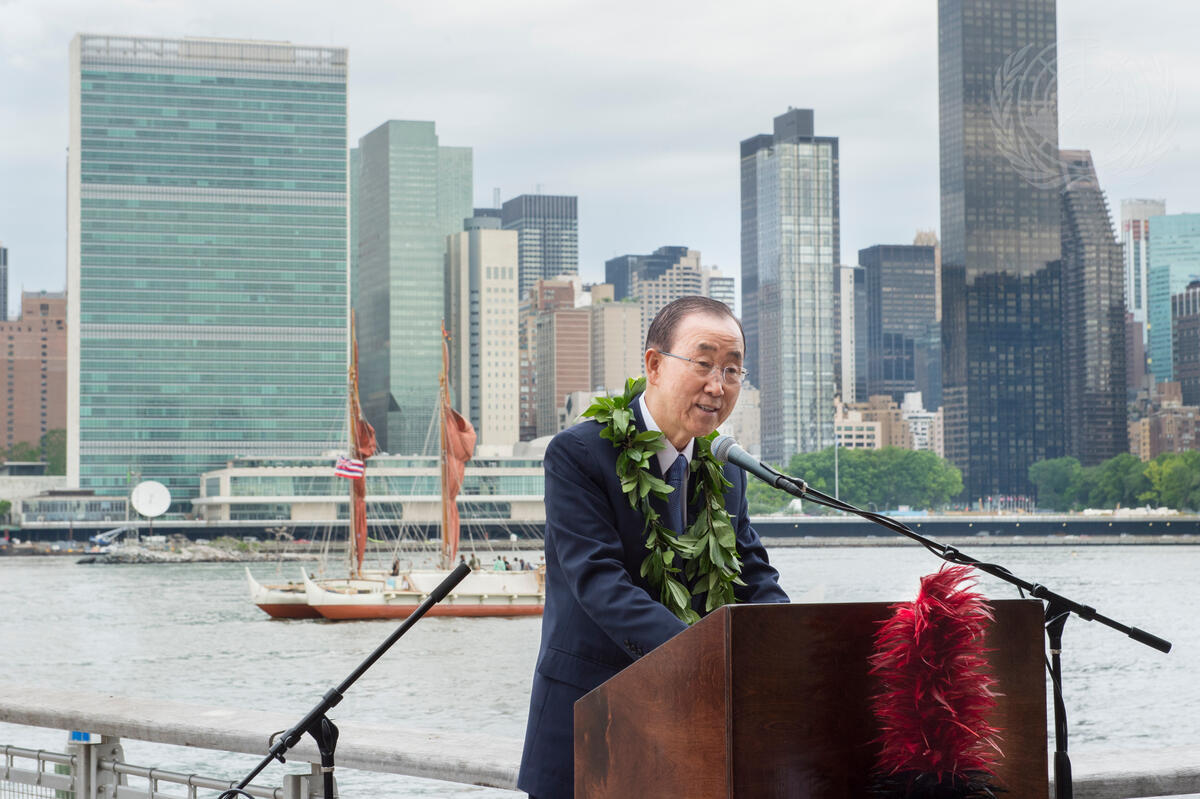 Secretary-General Ban Ki-moon speaking at a welcoming event in New York for the Hôkûle’a, a voyaging canoe of the Polynesian Voyaging Society, on World Oceans Day (8 June).