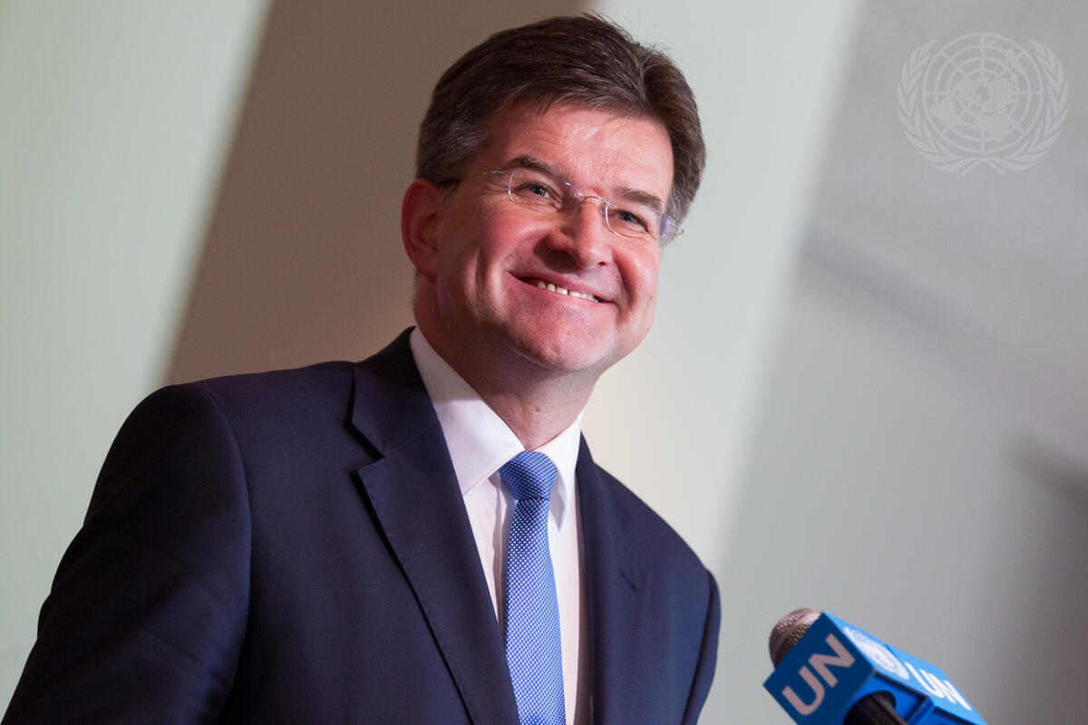 Miroslav Lajcák, Minister for Foreign and European Affairs of the Slovak Republic, speaks to journalists following his exchange with Member States regarding his candidacy.