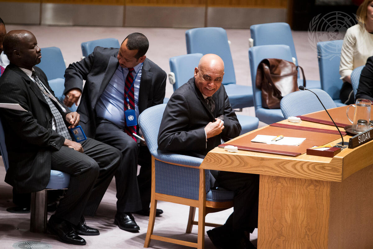 The delegation of the Republic of the Sudan, led by Omer Dahab Fadul Mohamed (at dais), Permanent Representative to the UN, at the Security Council meeting on the situation in Darfur.