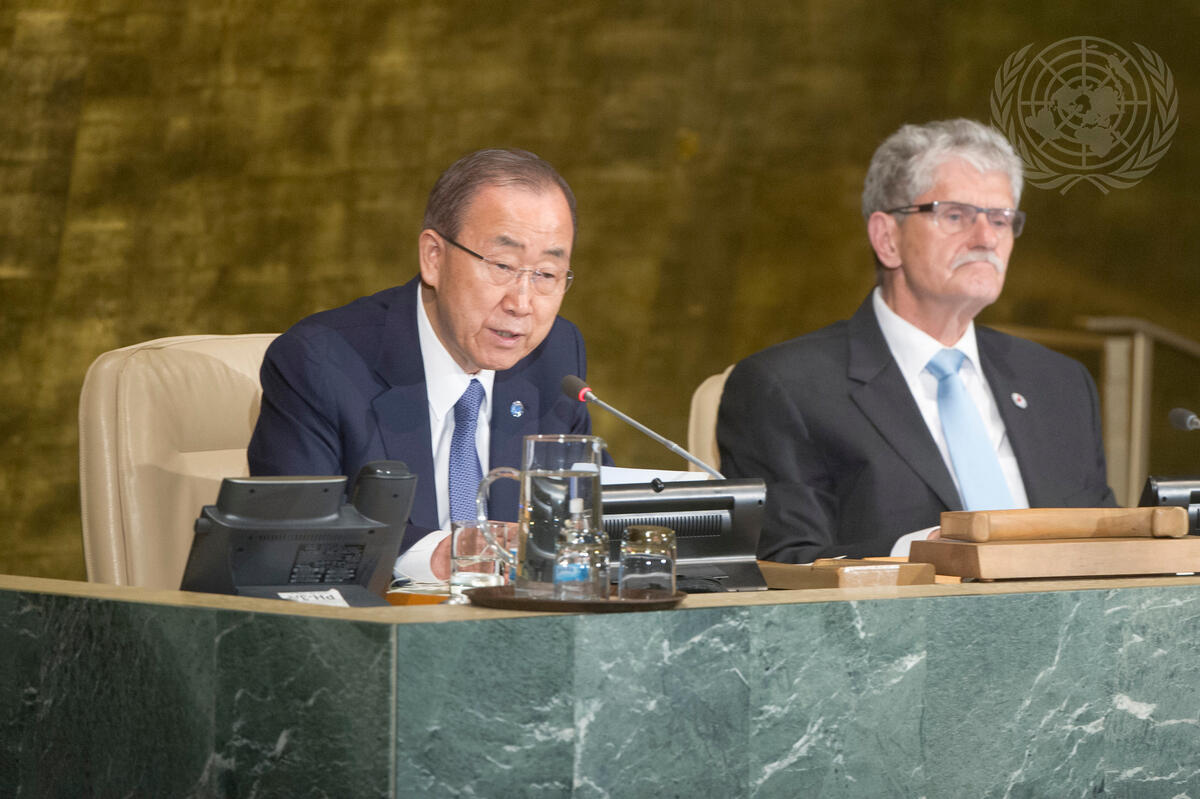 Secretary-General Ban Ki-moon (left) addresses the General Assembly High-level Meeting on HIV/AIDS. At right is Mogens Lykketoft, President of the Assembly’s seventieth session.