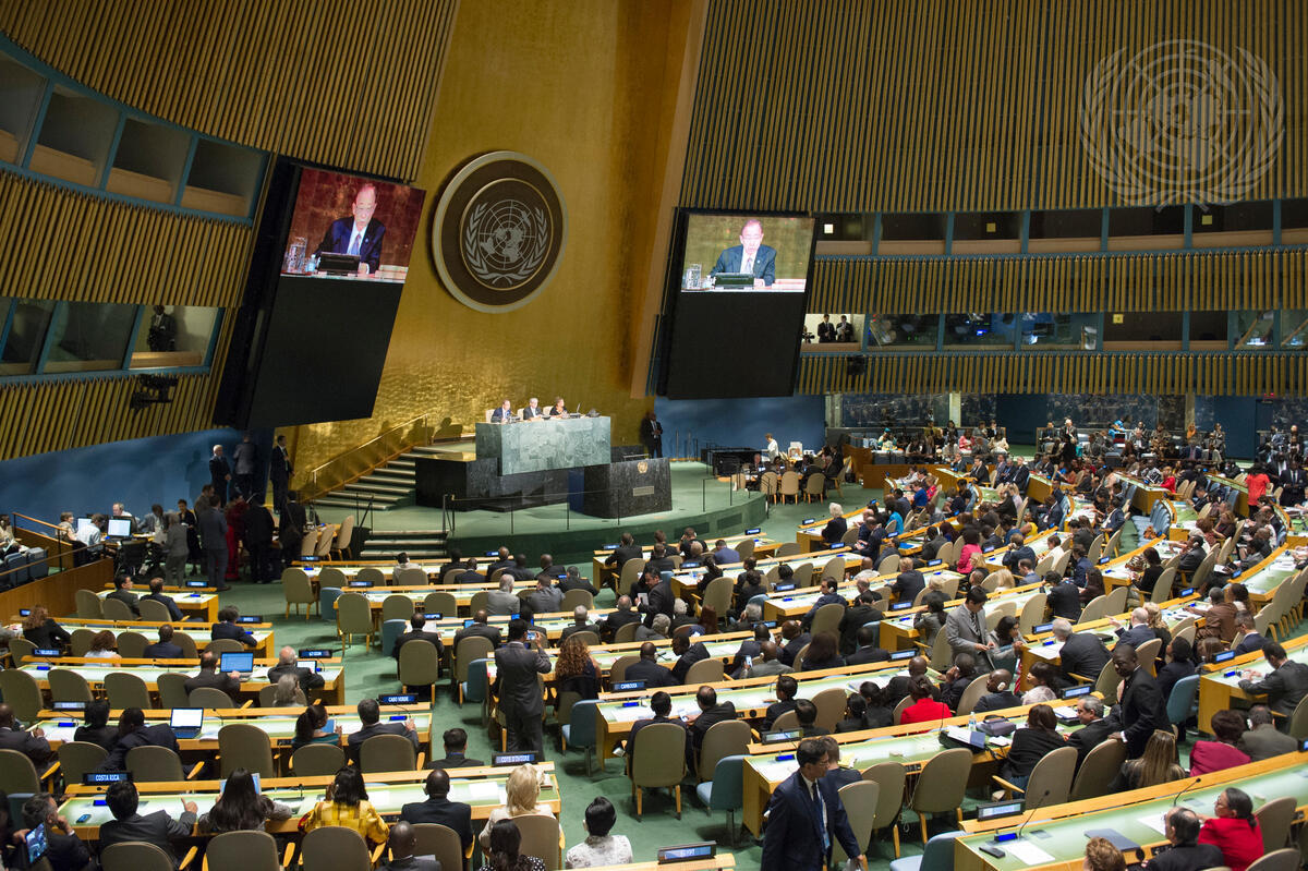 A view of the General Assembly Hall as Secretary-General Ban Ki-moon (shown on screens) addresses the Assembly’s High-level Meeting on HIV/AIDS.
