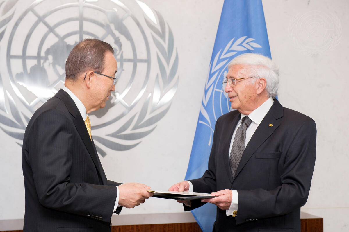 Horacio Sevilla Borja (right), new Permanent Representative of Ecuador to the United Nations, presents his credentials to Secretary-General Ban Ki-moon.