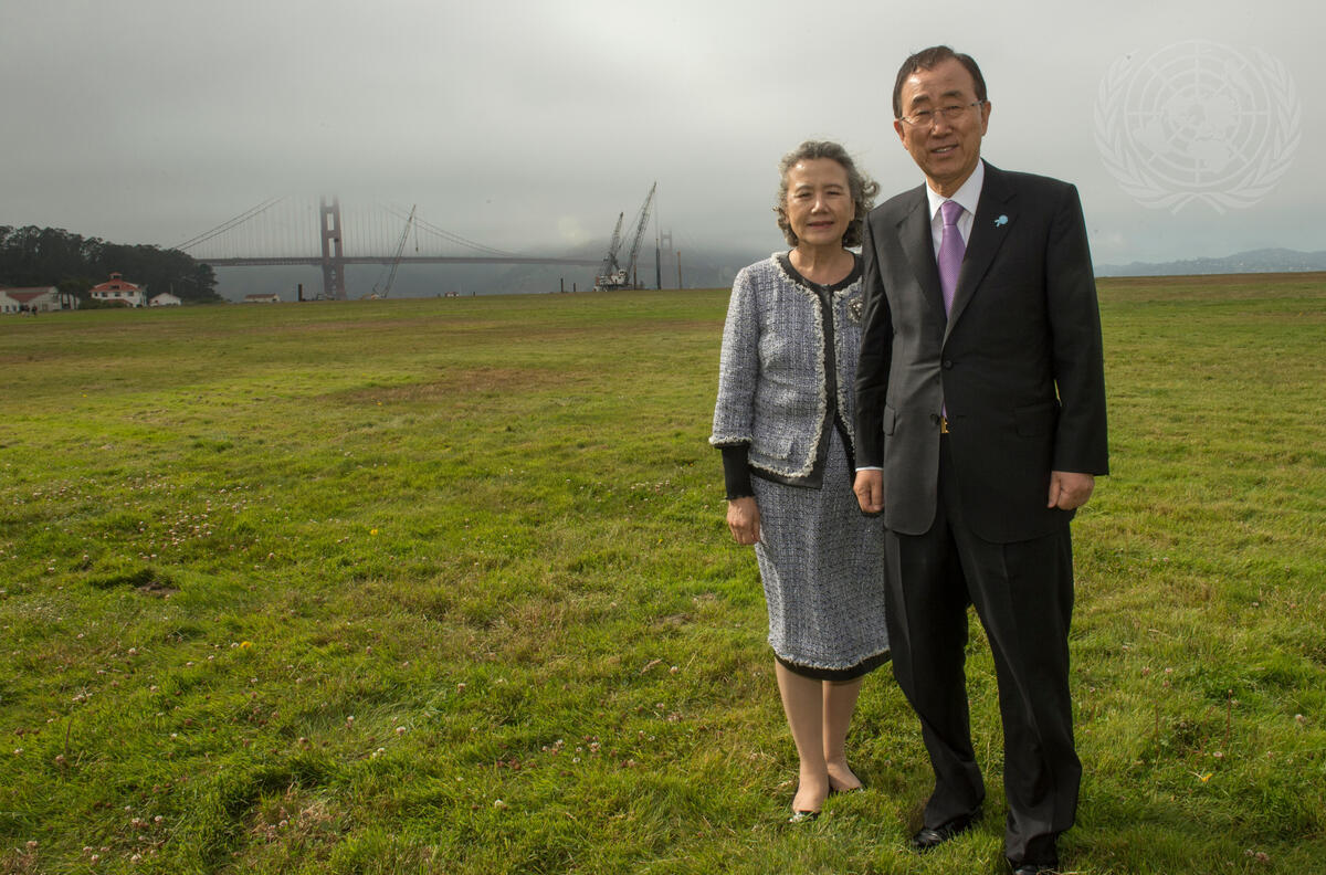 Secretary-General Ban Ki-moon (right) and his wife, Yoo Soon-taek (left) during his trip to Palo Alto, California to deliver a speech at Encina Hall of Stanford University in California entitled “The UN at 70: A conversation with UN Secretary-General Ban Ki-moon”.