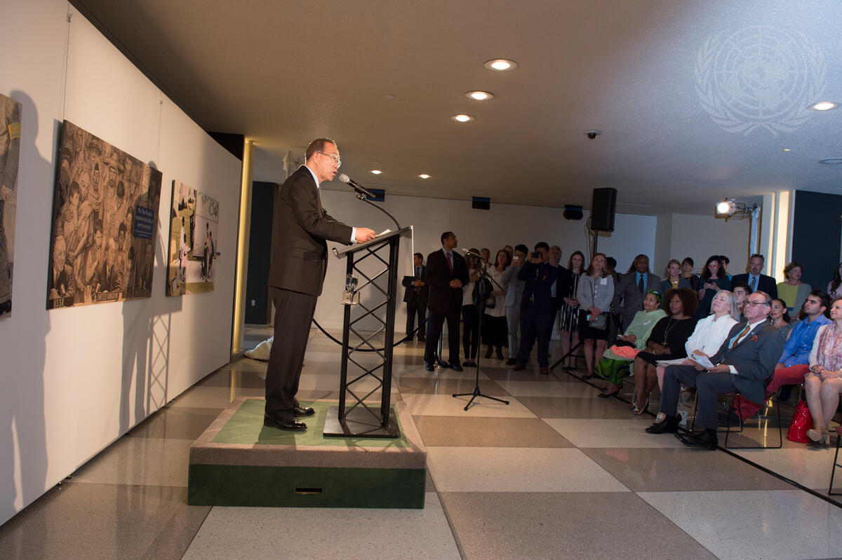 Secretary-General Ban Ki-moon delivers remarks at the exhibit opening of ""We the Peoples: Norman Rockwell's United Nations"", presented by the Norman Rockwell Museum in partnership with the United Nations Foundation and the UN Department of Public Information.