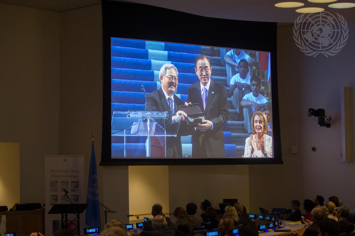 Broadcast of the UN Charter Commemoration Ceremony at the City Hall Rotunda in San Francisco with simultaneous transmission to New York. On the screen, the Secretary-General Ban Ki-monn receives the key of the City from Edwin M. Lee, Mayor of the City of San Francisco. This special event was part of the celebration of the 70th anniversary of the signing of the United Nations Charter in San Francisco on this day in 1945.