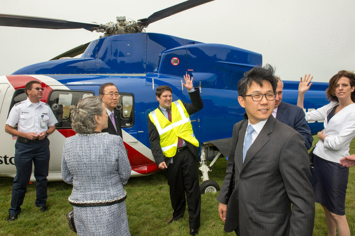 Secretary-General Ban Ki-moon (third from left) arrives with his team in Palo Alto, California, to deliver a speech at Stanford University entitled ""The UN at 70: A conversation with UN Secretary-General Ban Ki-moon"".