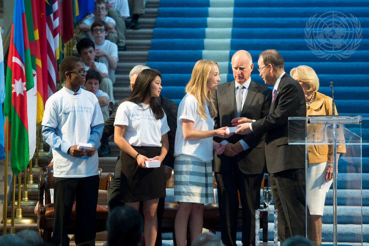 Caption Description Secretary-General Ban Ki-moon (second from right) greets young participants during the UN Charter Commemoration Ceremony in San Francisco. Looking on is Edmund G. Brown Jr. (third from right), Governor of California.