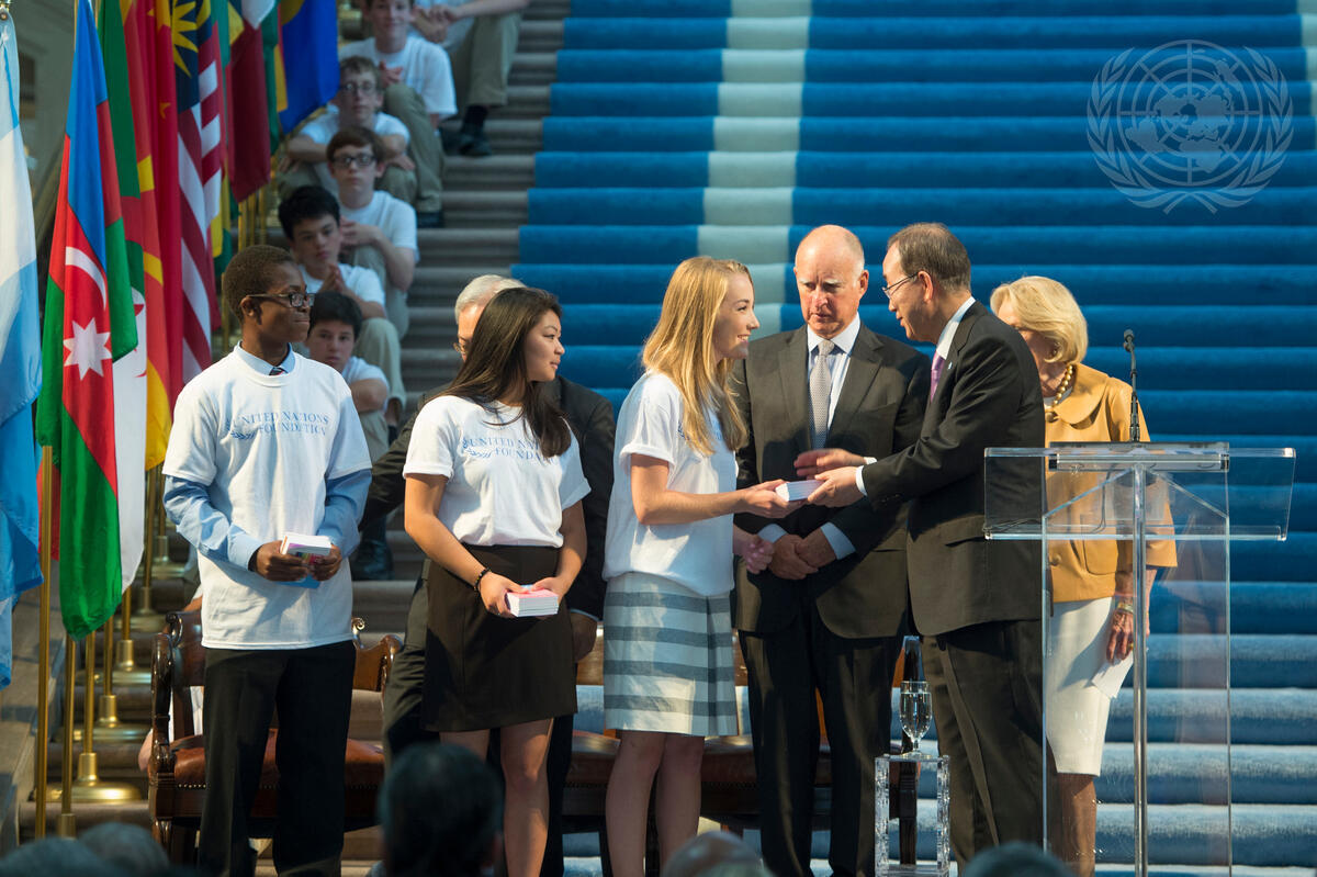 Secretary-General Ban Ki-Moon (right) presents the ""Delegation from the Future"" with copies of the UN Charter after his remarks at the Commemoration Ceremony in San Francisco as part of the celebration of the anniversary of the signing of the UN Charter in this city on this day in 1945.