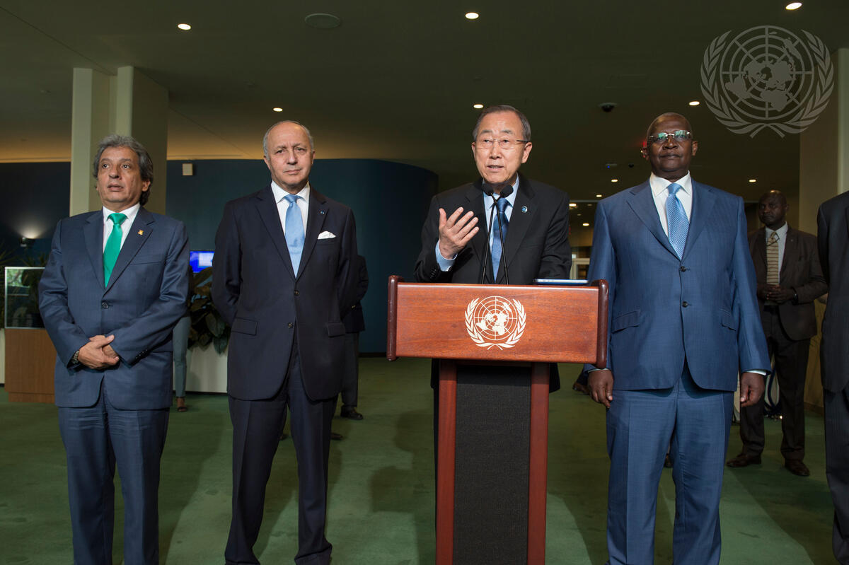 The Secretary-General (second from right), accompanied by Manuel Pulgar-Vidal (left), Minister of the Environment of Peru, Laurent Fabius (second from left), Minister for Foreign Affairs of France, and Sam Kutesa (right), President of the sixty-ninth session of the General Assembly, at a press encounter on the General Assembly’s high-level meeting on climate change.