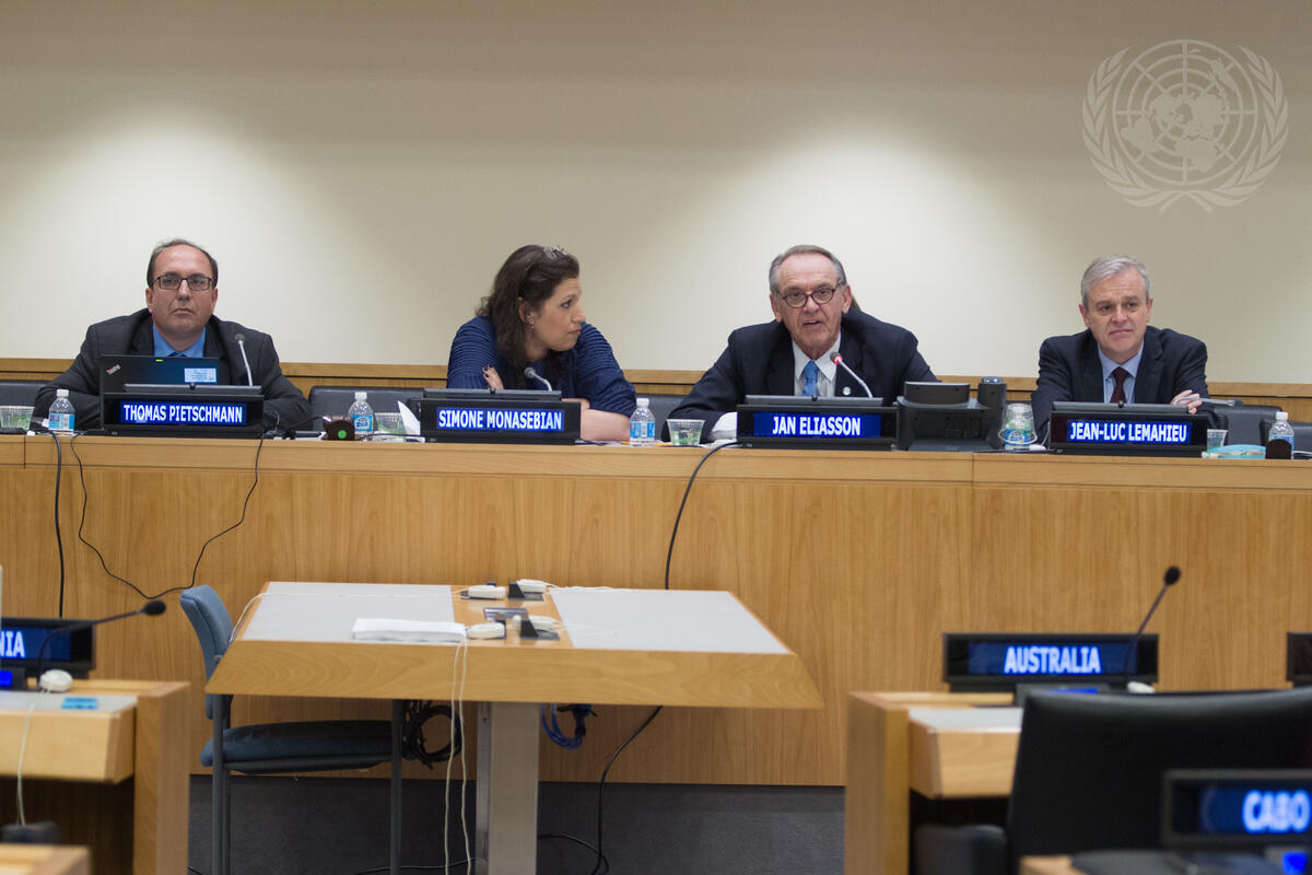 Jan Eliasson, Deputy Secretary-General, addresses the launch of the UN Office on Drugs and Crime (UNODC)’s World Drug Report 2015 on the International Day against Drug Abuse and Illicit Trafficking. He is joined by Thomas Pietschmann (left), Research Officer with UNODC, Simone Monasebian (second from left), Director of the New York Office of UNODC, and Jean-Luc Lemahieu (right), Director for Policy Analysis and Public Affairs at UNODC.