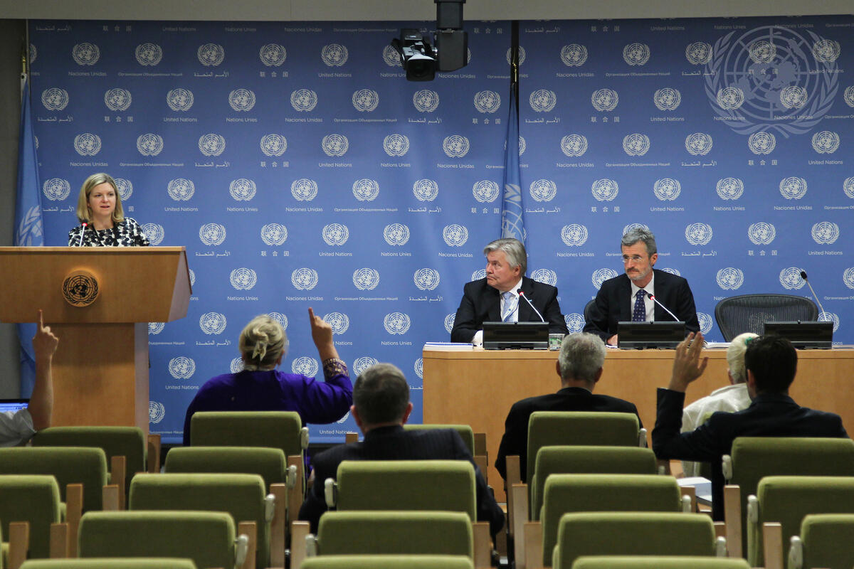 Henrik Madsen (top centre), member of the UN Global Compact Board and President and Chief Executive Officer of DNV GL Group, a global risk management and certification company; along with Georg Kell (top right), Executive Director of the Global Compact, brief journalists on the report, “Impact: Transforming Business, Changing the World”. Published by DNV GL on the occasion of the 15th anniversary of the Global Compact, the report assesses the progress achieved by the initiative in promoting corporate responsibility and sustainability. The Global Compact has 8,400 active corporate participants from over 150 countries, committed to doing business responsibly, in line with universal principles encompassing human rights, labour rights, environmental protection and anti-corruption efforts. Also briefing journalists was Georg Kell, Executive Director of the Global Compact.