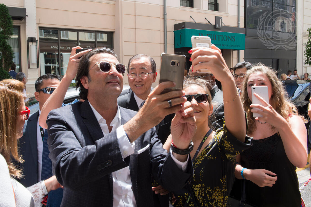 Passers-by take selfies with Secretary-General Ban Ki-moon in Cannes, France, outside the venue where Mr. Ban attended a luncheon hosted by Project Everyone, a campaign to publicize worldwide the UN Sustainable Development Goals.