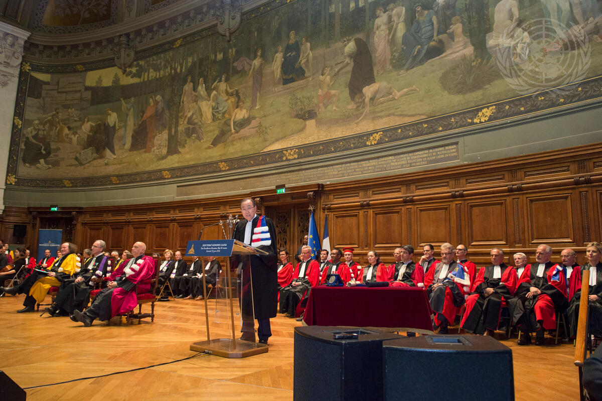 Secretary-General Ban Ki-moon (centre) delivers remarks at the special ceremony where he received an honorary doctorate from Pantheon-Sorbonne University in Paris.