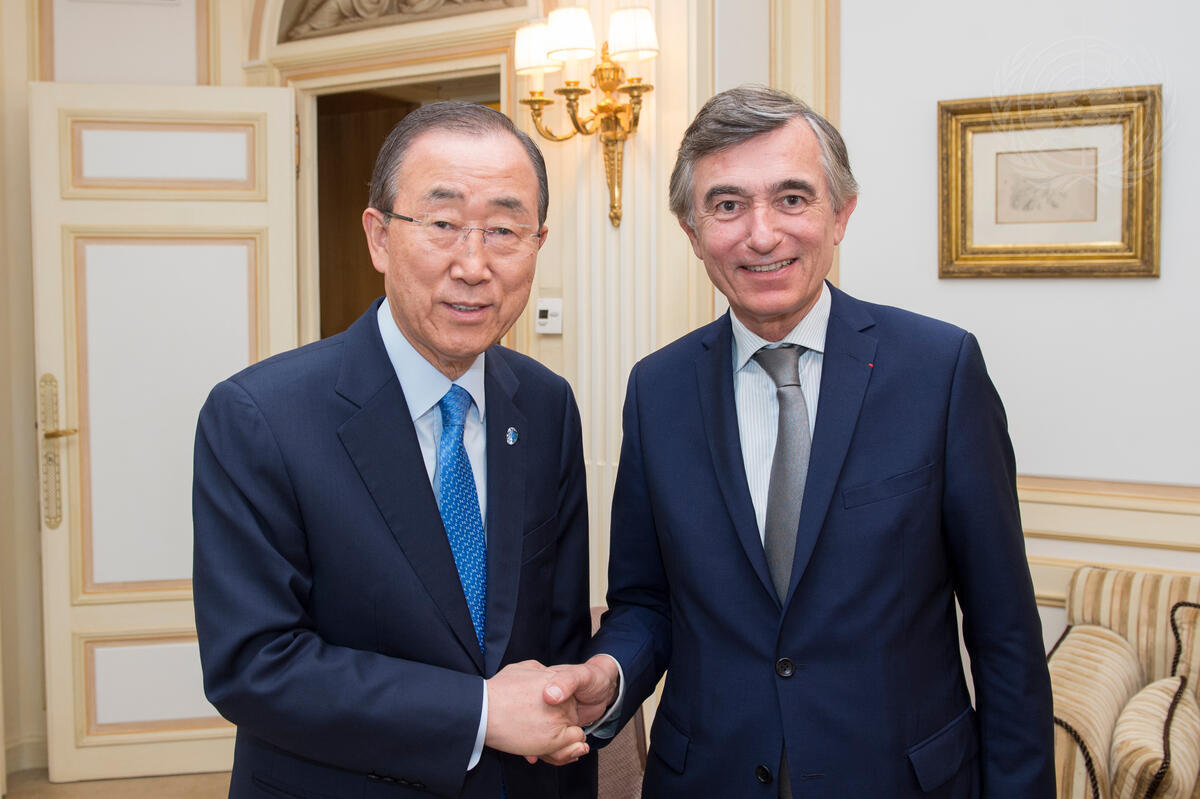 Secretary-General Ban Ki-moon (left) meets with Philippe Douste-Blazy, his Special Advisor on Innovative Financing for Development, in Paris.