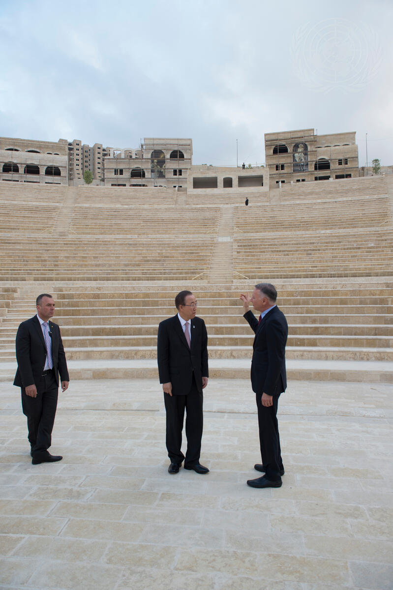 Secretary-General Ban Ki-moon (centre) during his visit to the Palestinian city of Rawabi in the West Bank.