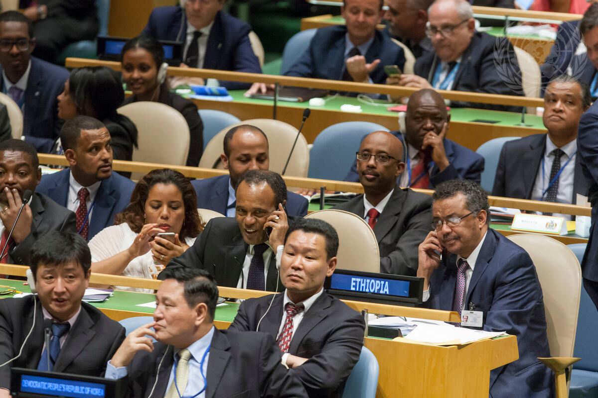 The delegation of Ethiopia, led by Tedros Adhanom Ghebreyesus (right), Minister for Foreign Affairs, in the General Assembly Hall following Ethiopia’s election to a non-permanent seat on the Security Council. Pictured at the Minister’s side, Tekeda Alemu, Permanent Representative to the UN.