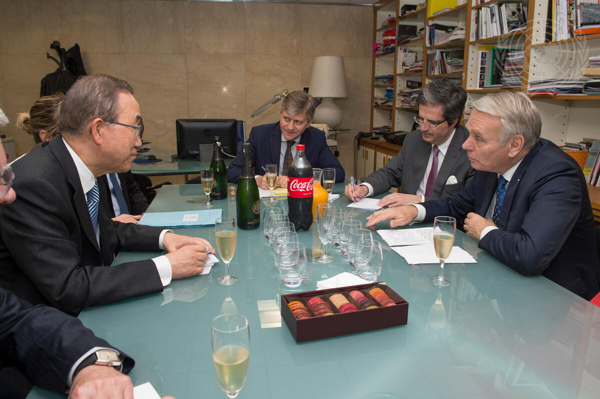 Secretary-General Ban Ki-moon (left) meets with Jean-Marc Ayrault (right), Minister for Foreign Affairs and International Development of France, in Paris. Also pictured, François Delattre (second from right), Permanent Representative of France to the UN.