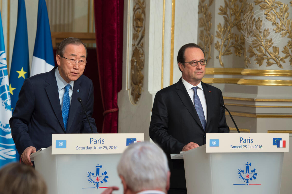 Secretary-General Ban Ki-moon (left) and François Hollande, President of France, brief the media following their meeting in Paris.