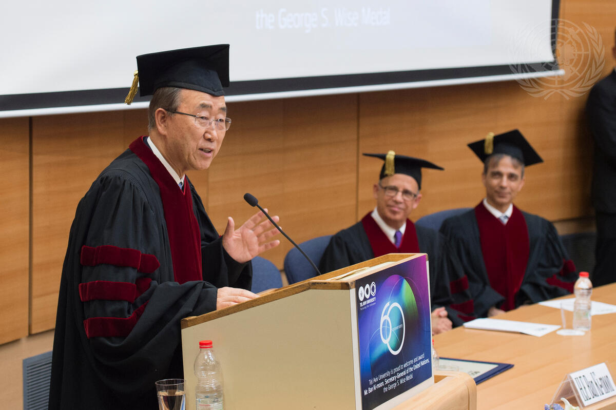 Secretary-General Ban Ki-moon visited Tel Aviv University today, where he received the George S. Wise Medal, spoke to students and faculty and met with private sector representatives and the University's research centres focusing on innovation and sustainable development.