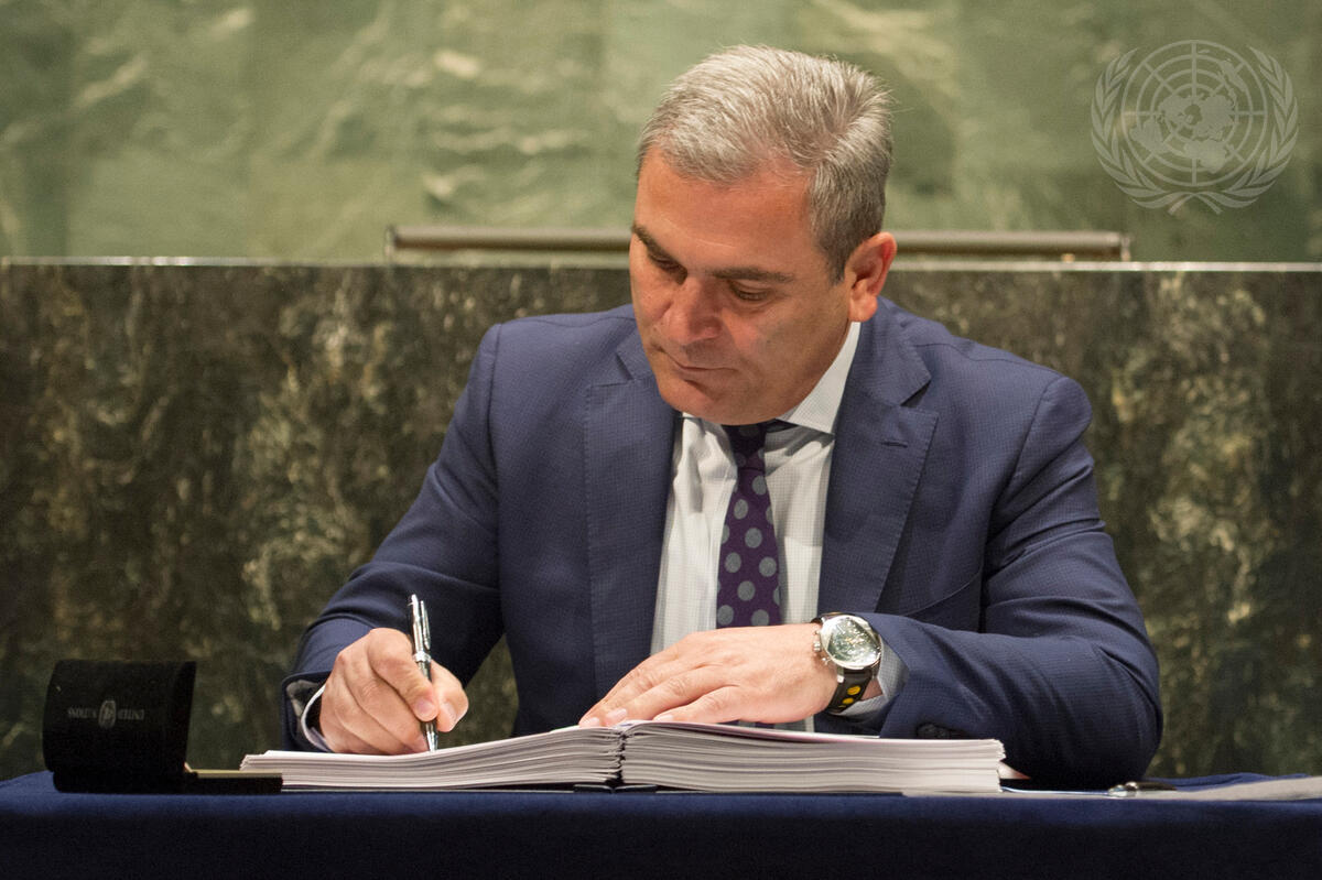 Gigla Agulashvili, Minister of Environment and Natural Resources of Georgia, signs the Paris Agreement.