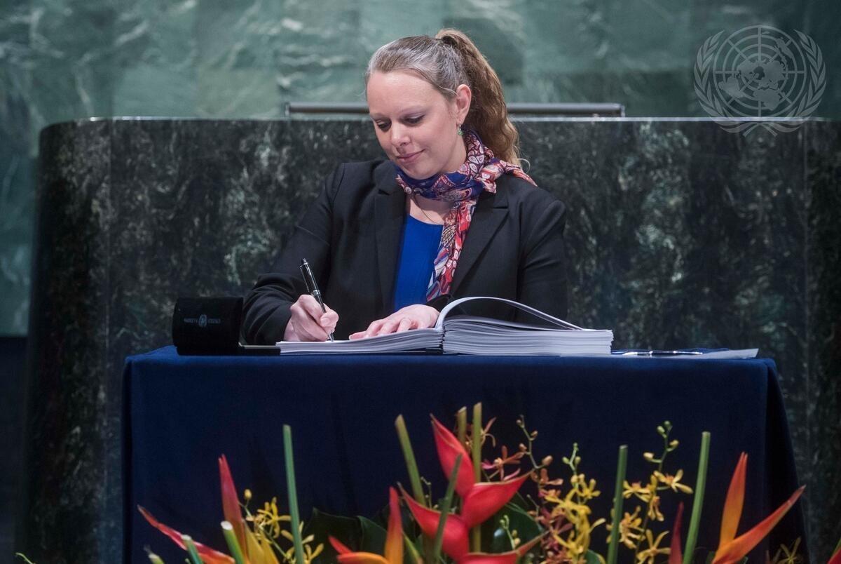 Carole Dieschbourg, Minister for the Environment of Luxembourg, signs the Paris Agreement.