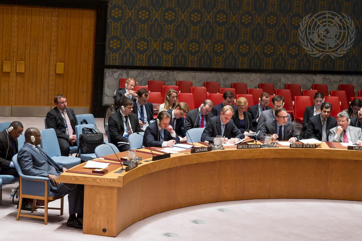 David Pressman (second from right, front) Alternate Representative for Special Political Affairs, United States Permanent Mission to the UN, addresses the Council, as George S. W. Patten, Sr. (front left), Chargé d'affaires a.i., Permanent Mission of the Republic of Liberia, listens.