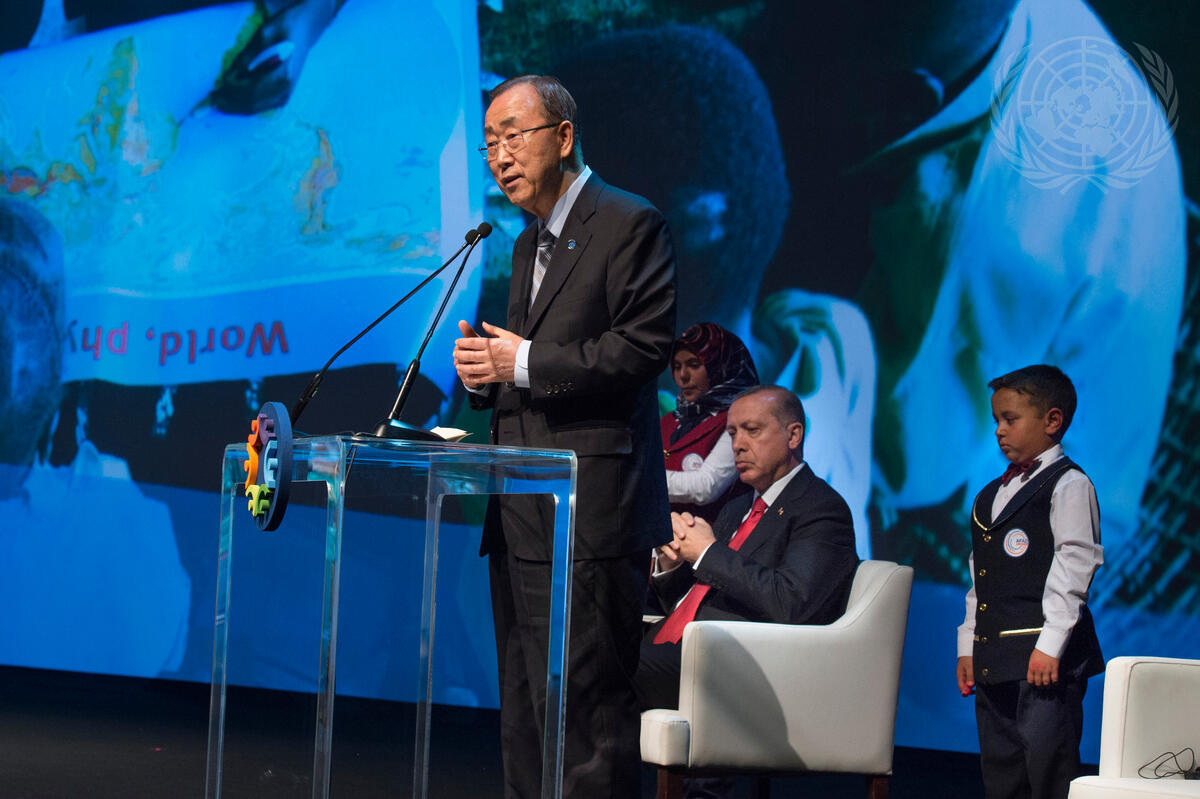 Secretary-General Ban Ki-moon addresses the closing ceremony of the World Humanitarian Summit, which took place in Istanbul, Turkey, on 23-24 May. Pictured looking on: Recep Tayyip Erdogan (seated), President of Turkey; and two young participants in the ceremony.