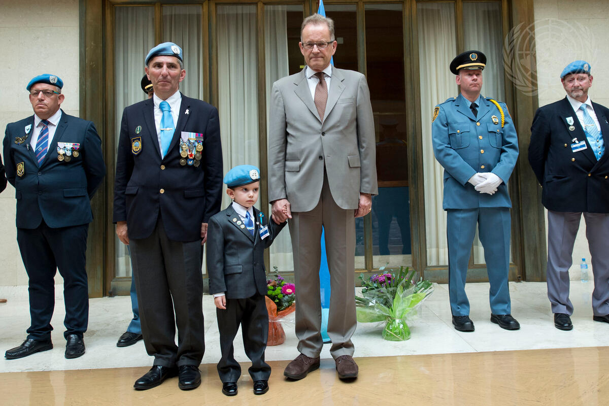 Michael Møller (centre right), Director-General of the United Nations Office at Geneva (UNOG), and Laurent Attar-Bayrou (centre left), President of Soldiers of Peace International Association, with a very young guest, at UNOG’s commemoration of the International Day of United Nations Peacekeepers (29 May).