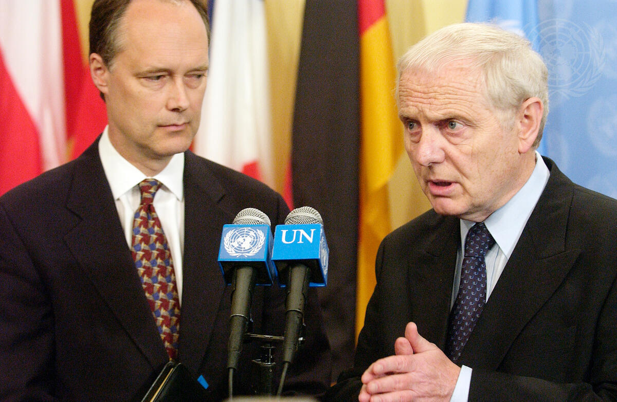 Ambassador Emyr Parry Jones (right) (United Kingdom) addresses the press following Security Council consultations on Iraq. On the left is Ambassador James B. Cunningham, Deputy Permanent Representative of the United States.