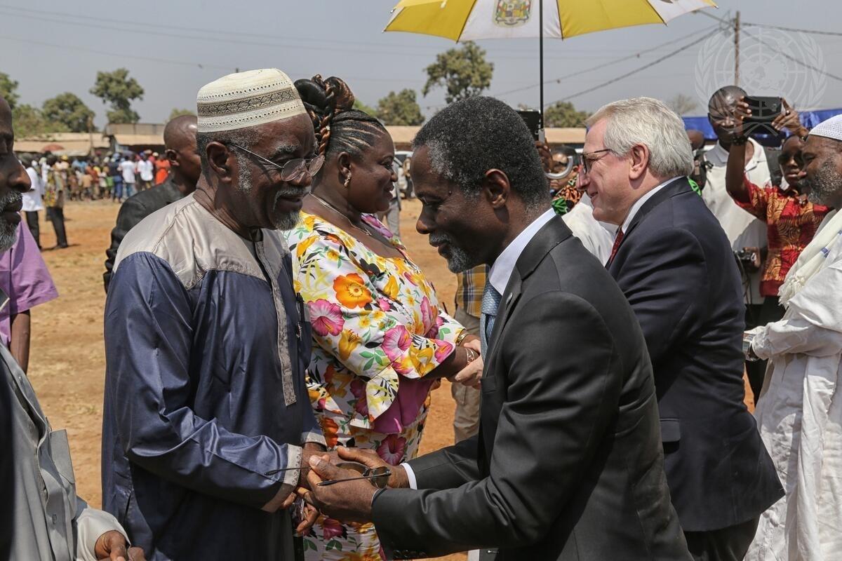 Parfait Onanga-Anyanga (foreground right), Special Representative of the Secretary-General and Head of the UN Multidimensional Integrated Stabilization Mission in the country (MINUSCA), greets community leaders during the ceremony.