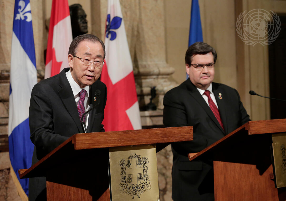 Secretary-General Ban Ki-moon (left) addresses a joint press conference with Denis Coderre, Mayor of Montréal, Canada.