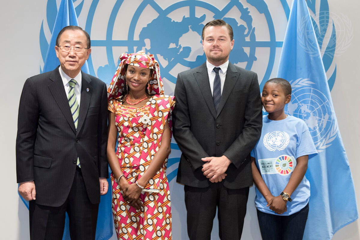 Mr. Ban poses for a group photo with three of the speakers who addressed the opening segment of the signature ceremony. From left: Hindou Oumarou Ibrahim (from Chad), civil society representative; UN Messenger of Peace Leonardo DiCaprio; Getrude Clement, 16-year-old radio reporter from Tanzania and youth representative and climate advocate with the UN Children’s Fund (UNICEF).