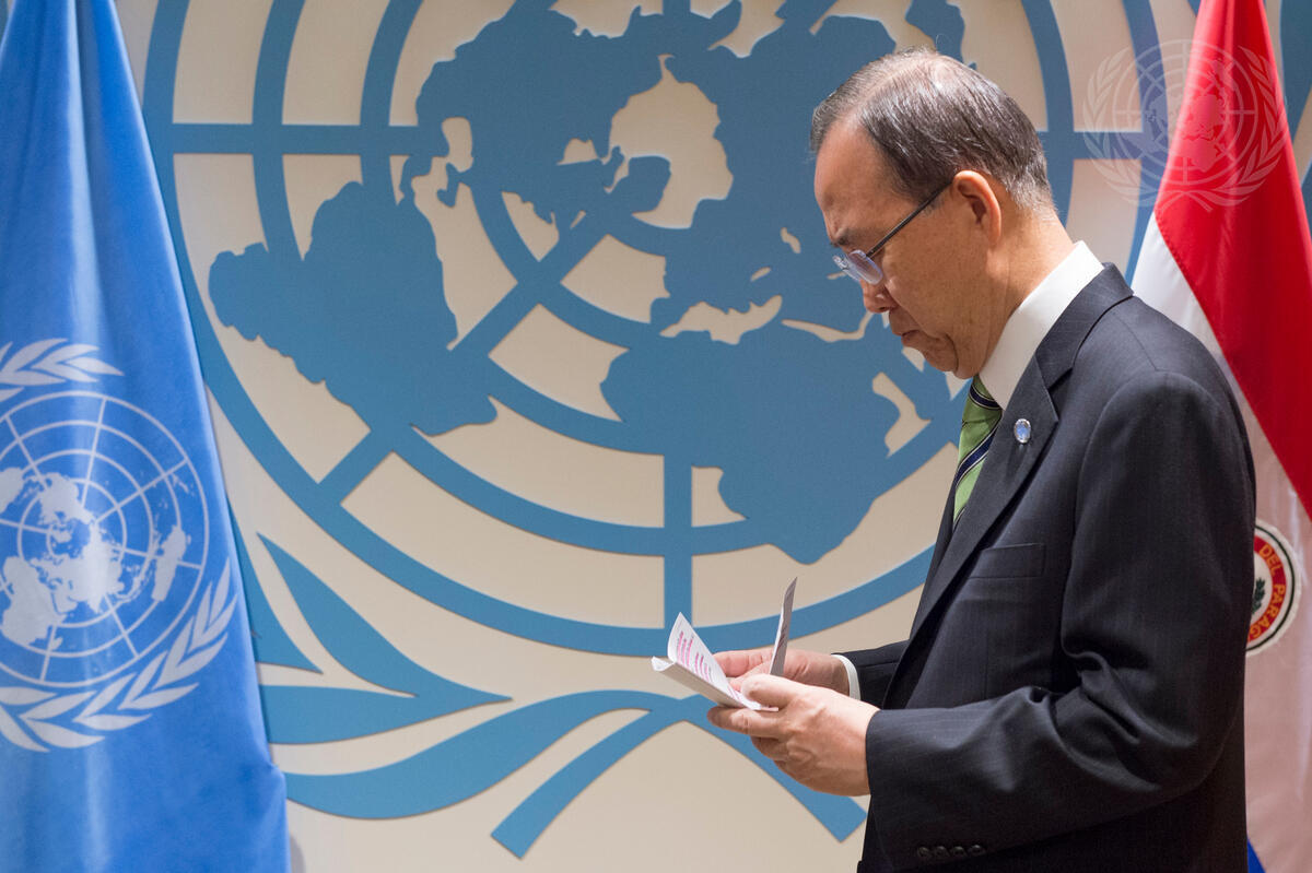 Secretary-General Ban Ki-moon prepares to make opening remarks at today's signature ceremony.
