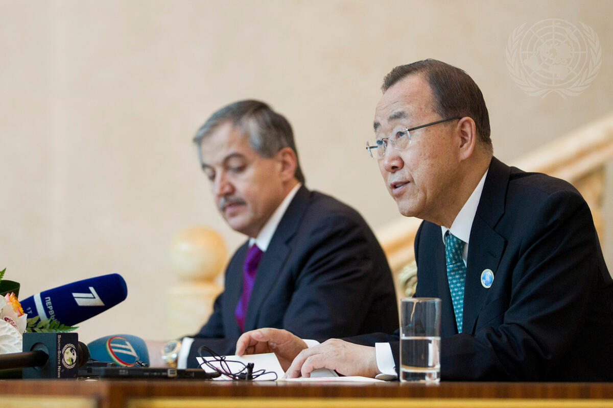 Secretary-General Ban Ki-moon (right) addresses a press conference in Dushanbe, Tajikistan. Beside him is Sirodjidin Aslov, Minister for Foreign Affairs of the Republic of Tajikistan.