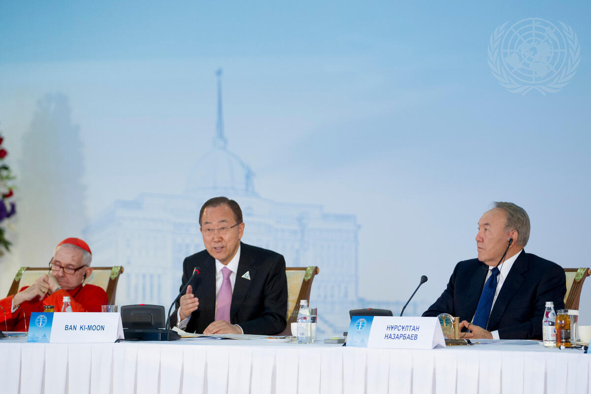 Secretary-General Ban Ki-moon (centre) addresses the Fifth Congress of Leaders of World and Traditional Religions: ""Promoting Dialogue for Peace and Prosperity in Turbulent Times"", taking place in Astana, Kazakhstan. At right is Nursultan Nazarbayev, President of the Republic of Kazakhstan.