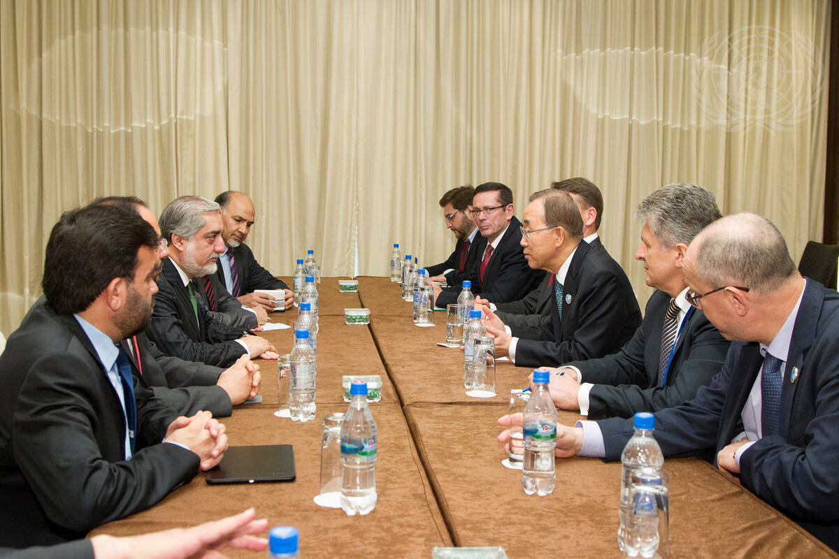 Secretary-General Ban Ki-moon (third from right) meets with Abdullah Abdullah (third from left), Chief Executive of the Islamic Republic of Afghanistan, in Dushanbe, Tajikistan.