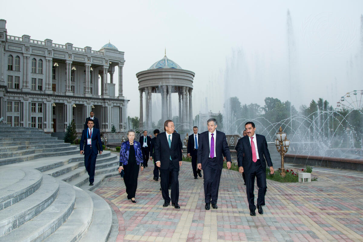 Secretary-General Ban Ki-moon (centre) and his wife, Yoo Soon-taek (second from left), walk with Sirodjidin Aslov (second from right), Minister for Foreign Affairs of the Republic of Tajikistan, and Mahmadamin Mahmadaminov (right), Permanent Representative of the Republic of Tajikistan to the United Nations.