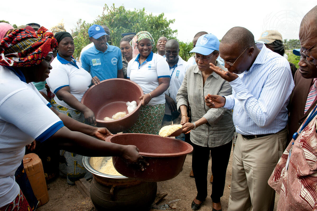 Aïchatou Mindaoudou Souleymane (fourth from right), Special Representative of the Secretary-General and Head of the United Nations Operation in Côte d’Ivoire (UNOCI), and M’Baye Babacar Cissé (third from right), Deputy Special Representative for UNOCI, participate in the production of manioc (cassava) in the town of Guiglo, Côte d'Ivoire.