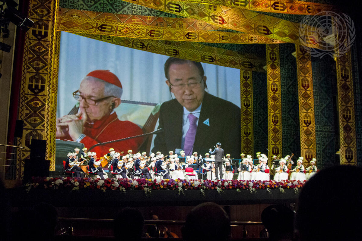 Secetary-General Ban Ki-moon (at right on screen) attends a concert at the Opera and Ballet Theatre in Astana, Kazakhstan, held in honour of the participants of the Fifth Congress of Leaders of World and Traditional Religions.